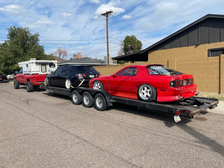 Jeff and I started with getting the two car trailer home. We purchased it late last year and have only used it one time to go to No Coast Drift Party. At that time the trailer brakes didn’t work and made the drive absolutely miserable. So first thing we wanted to do was inspect the brakes and figure out what was exactly wrong with them. We previously did some troubleshooting and found everything to be good expect for something in the drum itself. We gave power to the magnets manually and they still didn’t work. We suspected bad trailer magnets. A set of magnets was around $100 online, but when I talked to Joe about it, he recommended a shop where you could get loaded backing plates for just $33 each. We opted for the loaded backing plates for the $132 since the trailer had sat for around five years before we purchased it. Sure enough we found all four magnets to have failed, the wiring had fallen out of the magnets and they had a fair amount of rubbing on the drums. We took this opportunity to repack our bearings, inspect our seals, and give everything a good once over.